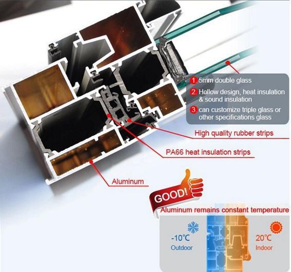 The aluminum thermal break design is popular in some USA and Europe project. As this photos showed you can see the thermal break nylon plastic in the middle , divide the aluminum frame into two layers , and one layer face outside room , the other layer face inside room.